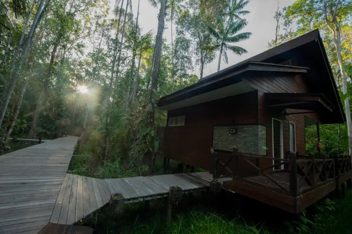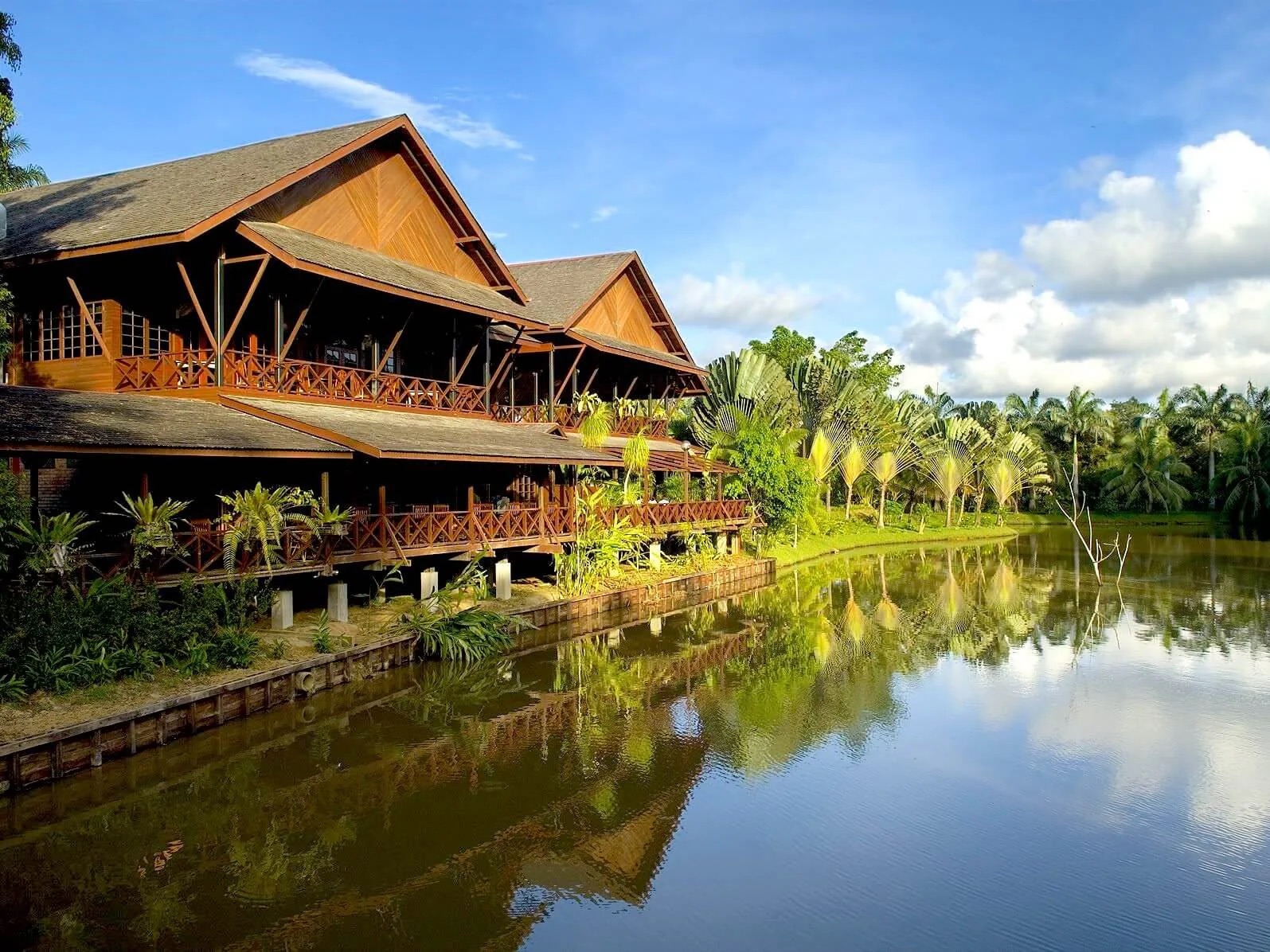 Kinabatangan Wetlands Resort sits beside one of Borneo’s most remarkable wildlife corridors, accessible only by boat from Sandakan. Raised walkways link a cluster of eight spacious chalets set among freshwater swamps and mangrove forest.